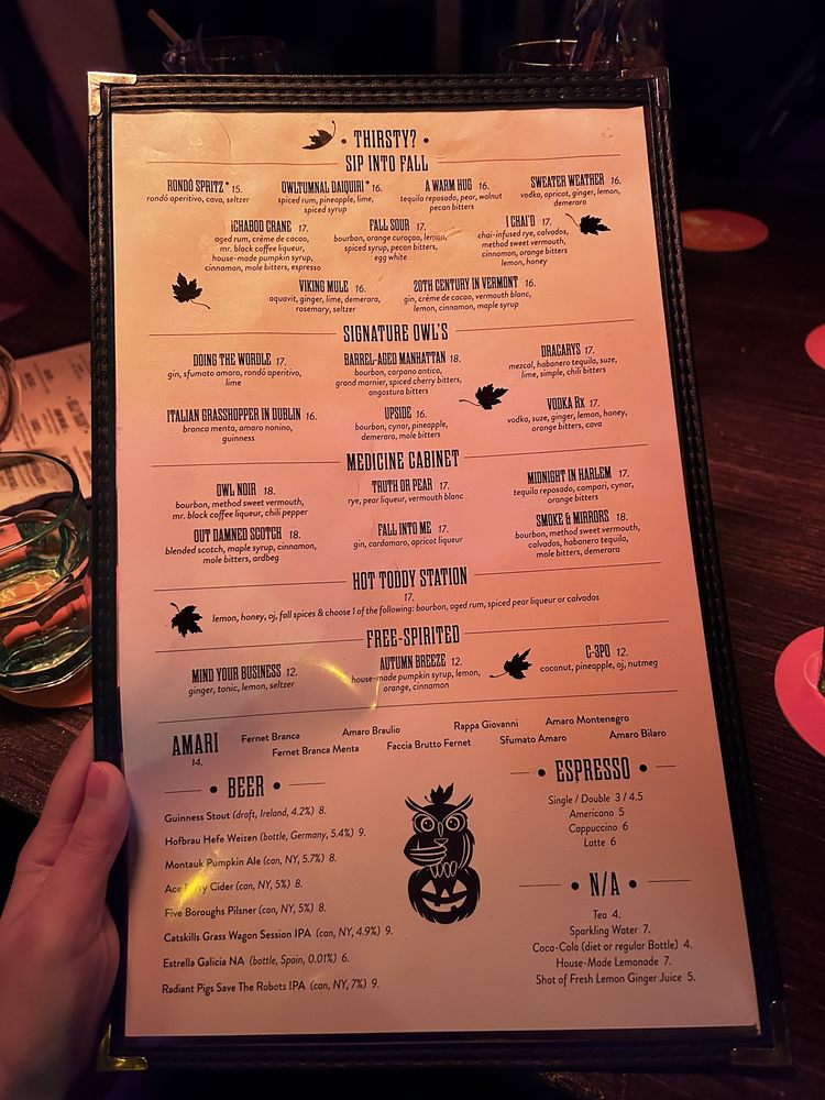 The Owl's Tail, located at 215 W 75th St in New York, offers a trendy and intimate atmosphere for patrons to enjoy. The menu features a variety of small bites, such as deviled eggs with truffle and flavorful meatballs, along with a selection of specialty cocktails like the Corpse Reviver #2 and the Heatwave. The bar is known for its seasonal cocktails, classic options, and friendly staff who are knowledgeable and accommodating. Customers praise the cozy ambiance, good drinks, and great service, making it a go-to spot for a chill evening or a lively night out. With options for outdoor seating, gender-neutral restrooms, and happy hour specials, The Owl's Tail caters to a diverse crowd and provides a welcoming environment for all. Get ready to experience a delightful culinary and cocktail journey at The Owl's Tail.